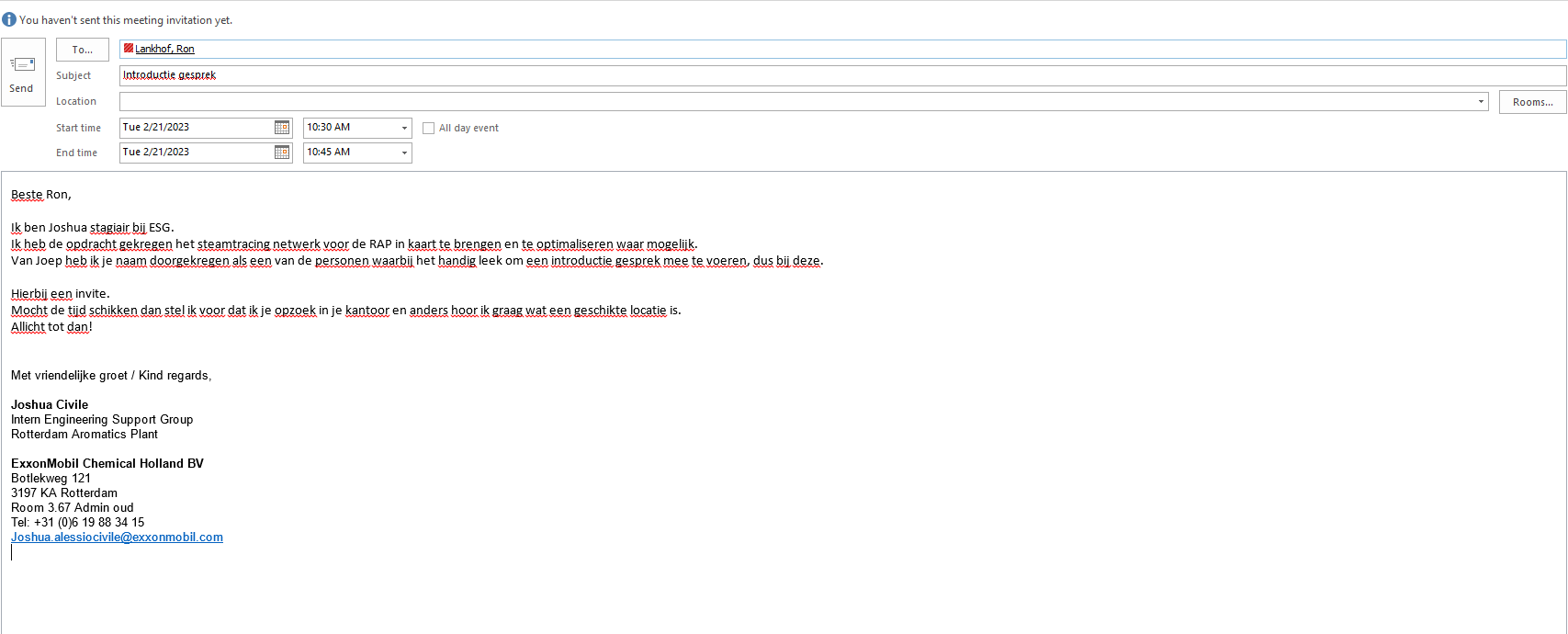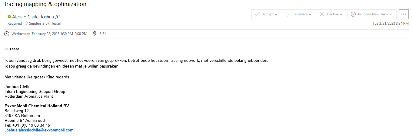 Vooraf de stage bij ExxonMobil heb ik een assignment description gekregen (Bijlage 1). Hierin is gesteld wat de opdrachtgever, ExxonMobil, van mij verwachtte. Om de behoeftes en waardes te inventariseren binnen ExxonMobil, ben ik de eerste weken hard beziggeweest met het plannen van verschillende gesprekken met verschillende belanghebbende om zo te achterhalen wat hun visie is op het gegeven probleem. En daarbij kennis op te doen van wat de mogelijkheden zijn en waarmee zij kunnen helpen. De opdracht kwam gedeeltelijk uit de behoeftes van de energiecoordinator en daarom heb ik er ook voor gekozen eerst andere belanghebbende te spreken, om zo met die bevindingen een gesprek aan te gaan met de energiecoordinator om deze te delen en haar verwachtingen en behoeftes verder te inventariseren. Bewijs van deze mails en agenda afspraken is te zien in Bijlage 3.